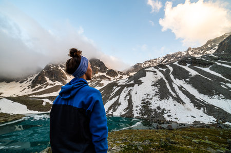 woman stands near a frozen mountain lake, looking at the sky opening up from the fog and snow-capped mountains at sunset