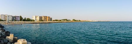 Sea promenade with people walking near deep calm cool Black Sea, against backdrop of ancient resort small town of Pomorie in Bulgaria under a cloudy soft blue sky