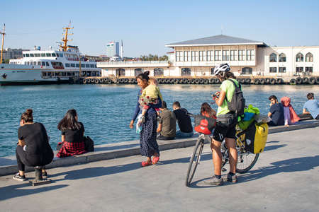 ISTANBUL, TURKEY - SEPTEMBER-14.2019: People resting on the seashore of Kadikoy coast.