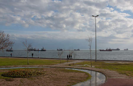 atakoy, istanbul, turkey-may 24,2021. seascape and marmara sea view from baruthane public park in atakoy district and early morning time.