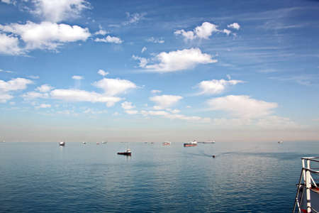 Passage through the Suez Canal by large sea vessels.Panoramic view of the coast and canal in the bays of Suez.