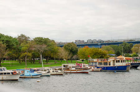 Halic,istanbul,Turkey.March 25,2022.Views from the Golden Horn shore with its green parks, historical and modern buildings.