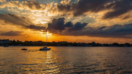 Sunset over the sea with a boat in the foreground, in the background is a beautiful sky.