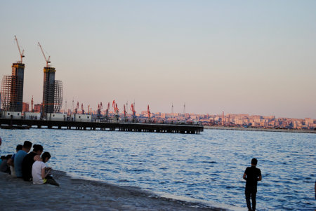 People enjoy sunset at the Caspian Sea. Baku Azerbaijan