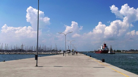 BURGAS, BULGARIA, JULY 15, 2015: View of a quay leading into the black sea near bulgarian city burgas. People are enjoying sunny day walking towards the sea while being refresed by gentle breeze.