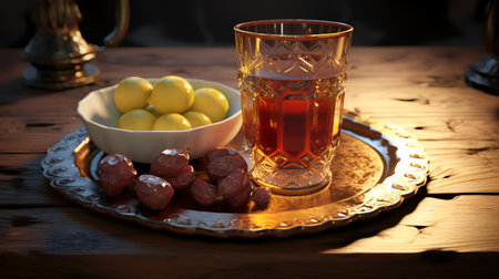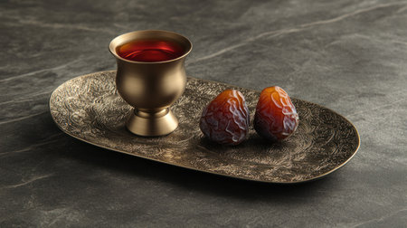 Delicious dates on a plate with a tea glass, decorated for Ramadan. Stock photo with copy space on a dark gray background, suitable for a banner. High-resolution photography. --chaos 30 --ar 16:9 --v 6.1 Job ID: 5eaab4b5-ba05-44df-92ce-2ff1f7bc750a