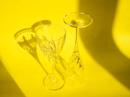 Empty glasses stand on a yellow background.A beautiful creative still life filled with light with hard shadows and highlights from the glass. Sunlight is refracted through the glass.Trending images.