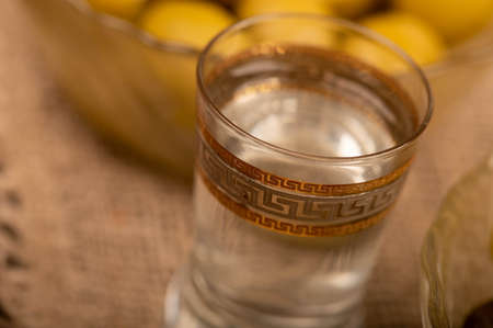 A glass of vodka and salted olives in a glass dish on a background of homespun fabric with a rough texture. Close-up Selective focus