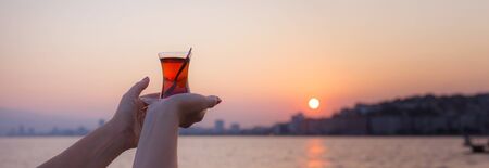 tea in traditional turkish glass on the female palm at dawn against the backdrop of the gulf of Izmir banner