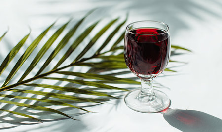 A glass filled with red liquid sits on a white surface, with a shadow of palm leaves. The lighting creates a contrast between the dark liquid and the bright background. This composition suggests a sunny, outdoor setting, possibly suitable for promotional materials or editorial content.