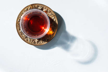 Close up of steaming cup of tea on vintage table - early morning breakfast. The tea is in the style of a traditional Turkish black tea against the backdrop of Istanbul. Soft backlight.