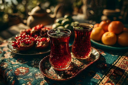 Two ornate glasses of tea sit on a decorative tray amidst a vibrant tapestry. surrounding them are pomegranate-topped pastries and assorted fruits, evoking a sense of warmth and hospitality. Generative AI