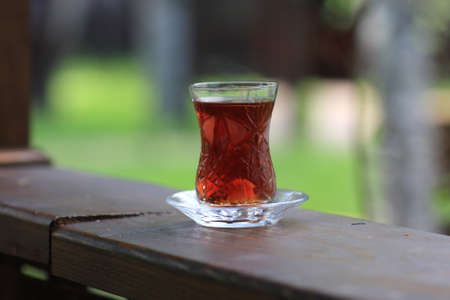 Turkish tea served in tulip-shaped glass on a small saucer blurred nature background. Summer holiday background.