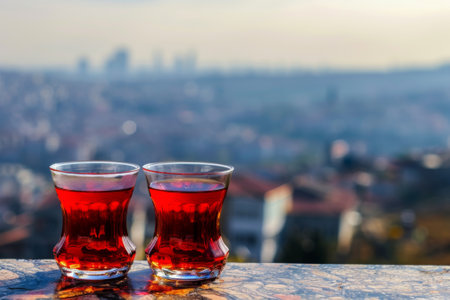 Two cups (armudas) of traditional Turkish tea are served on a table against the background of the Istanbul cityscape