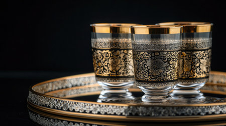 A stunning arrangement of elegant glassware on an ornate tray, capturing reflections with soft ambient lighting, perfect for a sophisticated dining atmosphere.