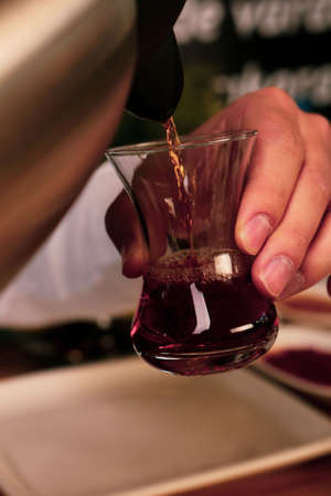 Turkish sweet tea served in traditional glass in restaurant in Istanbul, Turkey, close up