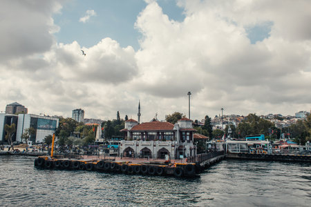 Istanbul, Turkey - November 2021: Kadikoy area in Istanbul, Turkey, a cityscape of Istanbul Kadikoy port area with ferry on Bosphorus