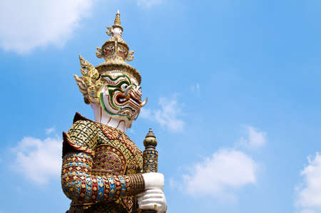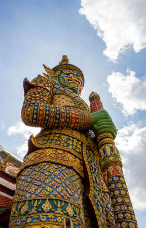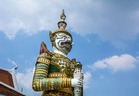 The Giant Demon Guardian with Temple and Blue Sky Background at Wat Phra Kaew, Grand Palace, Bangkok, Thailand.