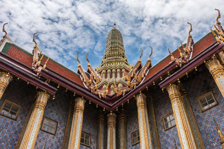 Bangkok, Thailand - Jun 19, 2020 : Beautiful Thai architecture of buildings in The Temple of the Emerald Buddha, the most sacred Buddhist temple in Thailand, it is also a potent religion symbolic of Thailand.