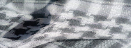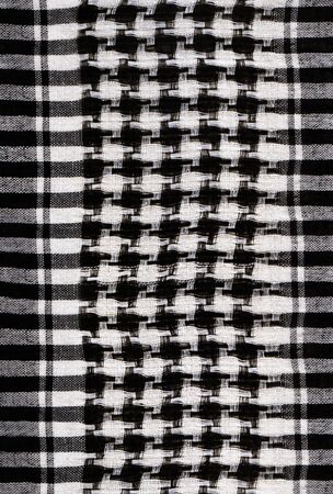 close-up of a Palestinian headscarf or kufiya. The traditional black and white headscarf of the Arab man (Keffiyeh). The weave forms a central path