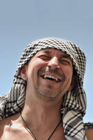 A young man in an Arab handkerchief. The man looks at the camera. On the roof of a house against the background of Arab houses.