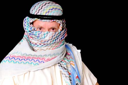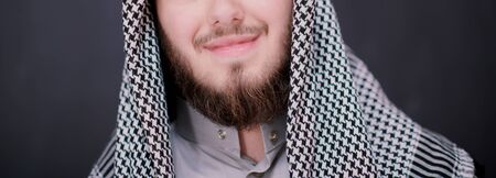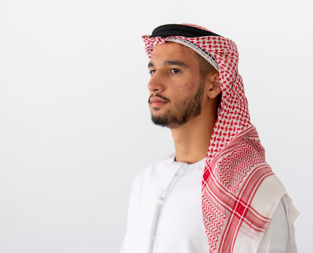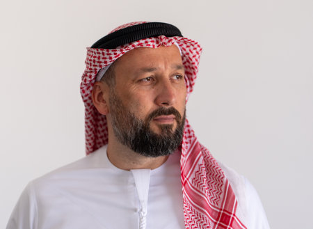 Close up portrait of man wearing traditional arabic clothing, standing against white background. High quality photo