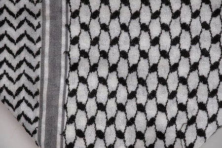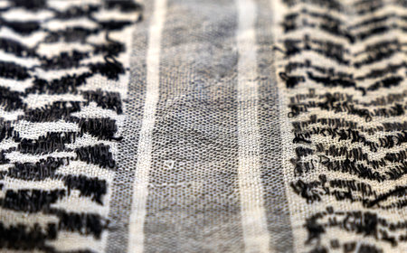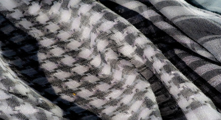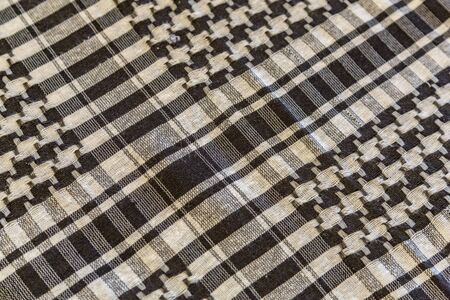 close-up of a Palestinian headscarf or kufiya. The traditional black and white headscarf of the Arab man (Keffiyeh). Selective focus