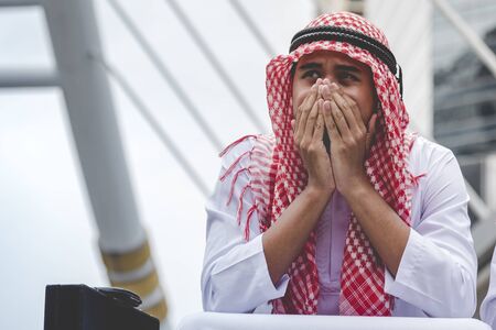 Unemployed jobless arabian businessman recession crisis stress losing job. Diversity arabian man despair office stressful depress. Despair economic world crisis from covid-19 coronavirus pandemics