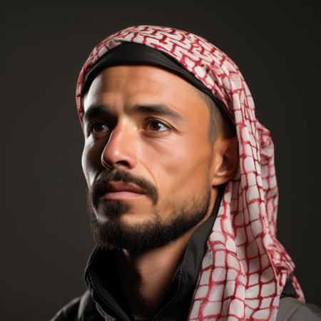 Close up portrait of a middle eastern man wearing a keffiyeh and gray sweater, conveying confidence and cultural pride