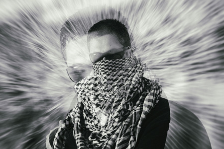 Mysterious single man wearing sunglasses and a keffiyeh with crossed arms with a defocused zooming coloured background using a double exposure effect.