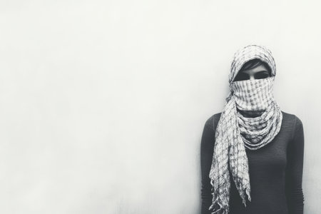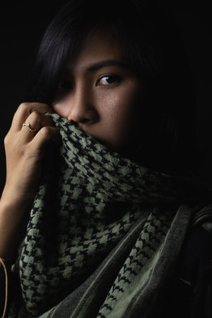 Person wrapped in a patterned scarf stands still, evoking mystery.