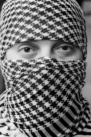 eyes of a man in arafatka. Man in arafatka. Portrait of a brunette man in a black and white arafatka