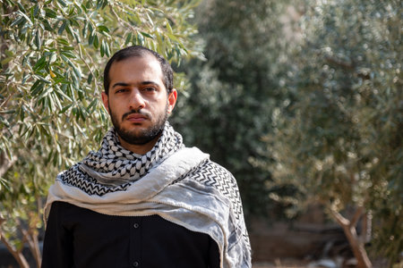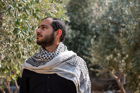 portrait for male wearing keffiyeh in olive tree field with black background and black shirts