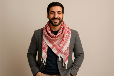 Portrait of a smiling businessman wearing a blazer and a keffiyeh scarf, posing with his hands in his pockets