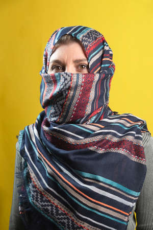 Portrait of a woman wearing hijab against black background. Salvador, Bahia, Brazil.