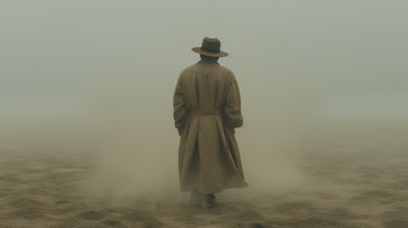 a man in a long coat walks along a stormy field, surrounded by dusty piles. the image captures trapped emotions with its dark beige and aquamarine tones. the cowboy imagery adds a touch of ruggedness to the poetic minimalism. this 8k portraitures holds hidden meanings waiting to be discovered. ai generated