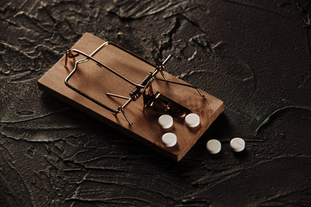Drugs trapped in a mousetrap. Concept of drug addiction. Copy paste.