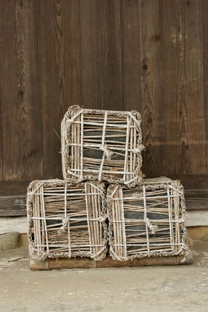 Seafood traps stacked in the harbour. fishing industry.