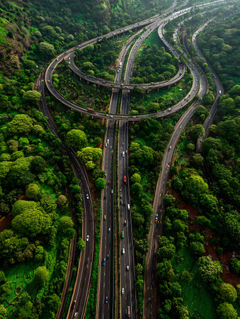 A high angle shot of a valley road with a cloudy blue sky in the background
