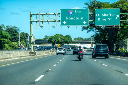 Honolulu, Hawaii-September 2015: Sloping roads with just a few cars with directions to Kailua exit in Honolulu.