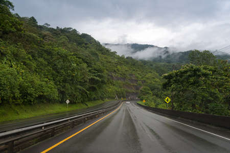 Road wet by rain among lush vegetation. Colombia