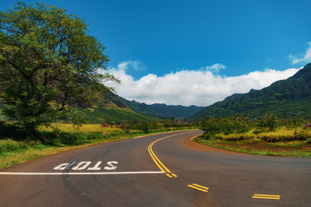 Winding serpentine road in Hawaii with tropical nature, mountains and ocean views, scenic travel landscape
