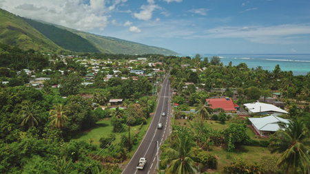 Lush tropical vegetation enveloping houses and a winding road leads to the stunning coast of Tahiti island, with cars cruising along the picturesque scenic route