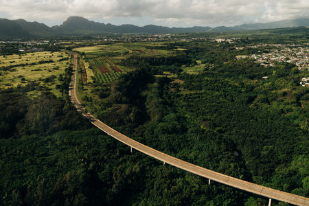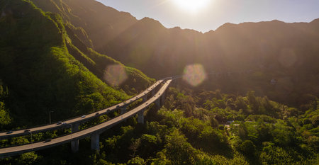 Aerial View of Highway Through Lush Mountains on Oahu Island, Hawaii
