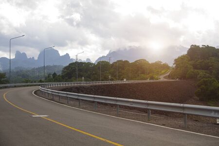 Asphalt road in the mountains at sunset. Beautiful summer landscape.