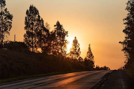 Silhouette of federal highway to the south of Brazil. Late afternoon. Colors and hues of the evening. Paths and distances. Feeling of peace and freedom. Horizon and path and in the background the sunset.