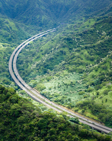 Aerial View of Highway and Ko olau Mountains on Oahu Island, Hawaii