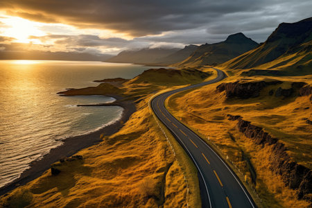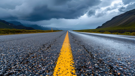 mountainous landscape with a road that disappears into the horizon in a cold climate and green pastures on the side