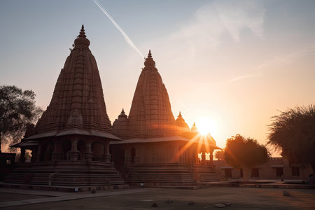 view of hindu temple, with the sun setting in the background, casting a warm glow over the building, created with generative ai