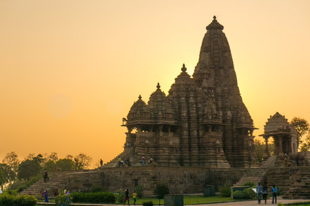 Khajurao, India, 6th Dec 2015: Sunset at the temples of Khajurao, India. These beautiful temples are a UNESCO site and a top tourist destination and draw many tourists